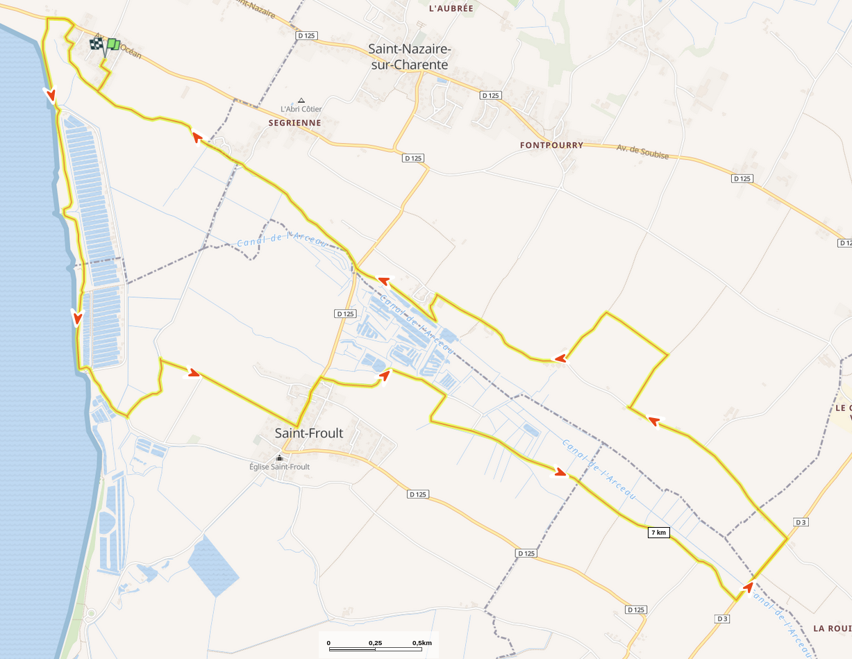 Sans attendre la pleine mer, prévue à 15h17…, nous traverserons Saint-Froult puis après avoir longer le canal de l’Arceau nous emprunterons sur 500m environ la D3 pour rejoindre les voitures en passant par les hameaux de Chassefert, la Bridonnerie, le Vert, Segrienne et la Percheronnerie.
